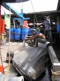 2009年11月10日,雪蘭莪適耕莊漁民捕獲一頭長約20呎,一噸多重的鯨鯊魚(俗稱蛤蟆鯊),引起注目。(圖:大馬星洲日報)