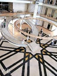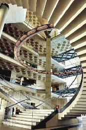 館內往上看,每層天花都有小圓形圖案,樓梯底部亦呈階梯形狀。(圖:香港明報)