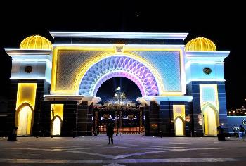 第14任國家元首端姑阿都哈林陛下登基大典前夕,吉隆坡大使路的新國家皇宮大門燈火璀燦,洋溢一片喜氣。(圖:馬新社)