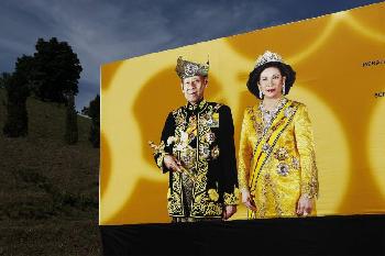 配合4月11日國家元首登基儀式,吉隆坡通往國家皇宮的路口早已設立起一個巨型廣告看板,板上附上國家元首端姑阿都哈林(左)和元首後端姑哈米娜的肖像。(圖:馬來西亞星洲日報)