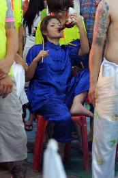 當乩童31年的他表示,他的神壇週日晚上首次進行“蒸活人”的儀式,而3名女兒也是第一次上陣當乩童。
