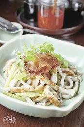 香芹魚鬆伴海蜇——菜式賣近百元,是因為採用的是頂級紅蜇頭,嘗過其爽脆程度,都會同意紅蜇頭值這個價錢。(圖:香港明報)