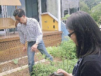2011年5月8日未正式宣佈參選前,梁振英曾在山頂大屋接待傳媒,並在三邊密封僭建的玻璃棚前,講解自己的種植心得。棚內可見有吊椅及有門通向大廳。(資料圖片)(圖:香港明報)