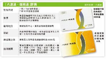 (香港)可以同時在香港及廣東省使用的“八達通.嶺南通”,7月2日正式面世。八達通與廣東嶺南通6月28日宣佈推出結合兩卡功能的聯名卡,卡內分別設港幣及人民幣戶口,市民日後可使用新卡,在香港及廣東省16個城市乘車及購物,但兩幣不能互相兌換使用,而最多港人活動的深圳亦不適用。八達通將於7月2日發售限量版新卡,並於7月18日全面發售。