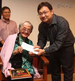姚莉把現場售賣40本自傳的4千令吉全捐給“希望閱讀基金會”,並由星洲日報副總編輯(副刊)曾毓林代領。(圖:馬來西亞星洲日報)