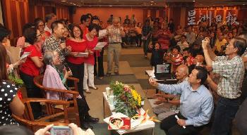 交流會現場不但有樂齡女歌迷上台擁抱姚莉,對她高唱《當我見到了你》訴衷情,還有雪隆舊曲知音聯誼會20位歌迷,用姚莉的歌名串成一首詩,並合唱《黑天堂》插曲《戀歌》送給她,並獲姚莉開心唱和。姚莉舉行簽會名時,這班樂迷還高唱《哪個不多情》送給姚莉呢!(圖:馬來西亞星洲日報)