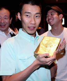 吉隆坡球拍俱樂部提供“金換金”獎勵計劃,重12.5公斤值200萬令吉的金磚,鼓勵大馬一哥李宗偉等人在倫敦奧運羽球賽中力爭金牌。(圖:馬新社)
