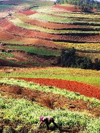 耕農在東川紅土地上,种滿了色彩丰富的農作物。(圖:馬來西亞星洲日報)