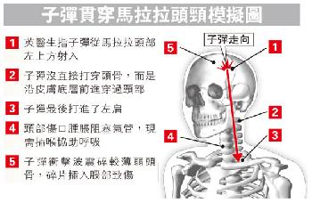 院方詳細解釋病情指,馬拉拉是頭顱左上方遭近距離開鎗,幸好子彈未有打穿頭骨,而是在頭顱皮膚底層穿過,子彈穿過頭部、頸部,打進了左肩。其間子彈的衝擊波將較薄弱的頭骨震碎,令碎片插入腦部致傷。如果子彈偏近頭部中央一兩吋,馬拉拉肯定早已喪命。