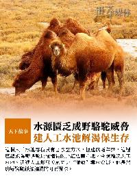 (中國)甘肅省動物保護者最新研究表明,比大熊貓還要稀少的野駱駝,駝群比以往有所擴大,駝羔增多。但戈壁灘日益匱乏的水資源,成為這種極耐饑渴動物的最大威脅。
