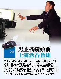 (美國)美國NBC《Today》主播波特(Mark Potter)近日可說倒楣,他在報導墨西哥灣漏油事故時,突然遭一隻蒼蠅“騷擾”。在驅趕不遂的情況下,波特不慎張嘴誤吞蒼蠅,害得他忍不住當場咳了起來,事後他無奈地自嘲吃了一頓“加料餐”。