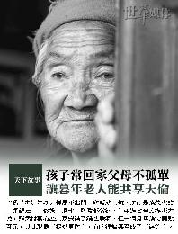 “當夕陽余輝照耀在人生最後的旅途上,誰來陪伴同行?”2011年7月,陜西啟動城鄉居民一體化社會養老保險制度,按新標準給農村居民發放養老保險金。被該政策惠及的延安甘泉縣姚店村民80歲的束志文表示,原來每月領70元,現在能領100元,零花錢足夠。但沒有親人在身邊就不像個家。雖然房子還是房子,東西還是東西。