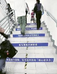 走在富士康廠房的樓梯,梯級貼有一句句鼓勵員工的標語,“機會總是留給有準備的人”、“魔鬼都藏在細節裡”,間接反映富士康的企業文化。(圖:香港明報)