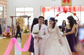 11時左右,新娘穿著9.9米長婚紗,跟新郎手牽手,在24名兄弟、姐妹的陪伴下,浩浩蕩蕩抵達善蓮堂。新人踩上吊車“騰空而起”,在大家的見證下“從天而降”,進入善蓮堂。