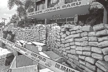兩名毒販連同1.5噸的大麻證物目前被送進佐哈爾峇魯警分署調查。(印尼星洲日報)