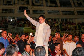 (馬來西亞)著名華人影星成龍3月23日晚在馬來西亞東北部重鎮關丹市參加了“龍情厚誼獻關丹”慈善演出活動,並現場募集資金,支持馬來西亞華文教育事業。