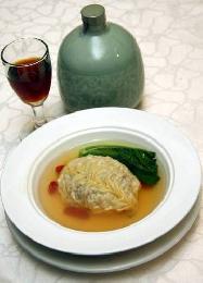 石榴海鮮球‧師傅以老母雞及雞腳熬煮上湯長達2天,火候十足,在烹煮時再下少許紹興酒調味,因此湯汁鮮甜無比。海鮮球皮薄陷料卻非常豐富,裡頭含有帶子、鮮蝦、蟹肉、瑤柱等,把所有海鮮的鮮味集中在一起,讓味蕾一次過品嚐何謂鮮甜。品嚐此佳餚時,不妨下少許青瓷紹興花雕酒10年陳,湯汁的鮮味加以提昇。 (圖:大馬光明日報)