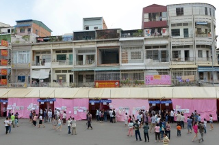 在金邊一個社區設的投票站,選民陸續到來履行他們的公民責任。(圖:法新社)