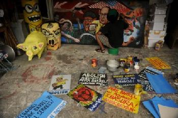 菲律賓政壇爆發國會議員透過白手套貪污經費的醜聞,引發眾怒。憤怒的民眾號召百萬人在週一(26日)早上,也就是英雄日當天,穿白衣上街頭抗議。圖為活躍人士為遊行用上場的橫幅和海報進行最後修飾。