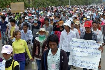 (柬埔寨‧金邊)數以百計柬埔寨成衣廠工人週二走上街示威要求加薪,他們手舉橫幅,浩浩蕩蕩遊行到金邊的社會福利部大廈前,要求政府正視他們的困境。