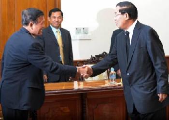 總理洪森與反對黨領袖沈良西週一在國會會談,以找出選舉爭議後的政治對峙解決方案。兩人在會晤前握手示意。會談閉門舉行,目前不清楚兩人的會談內容。