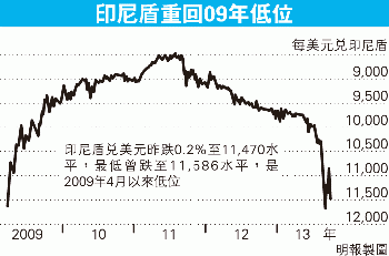 (印尼)投資者對聯儲局的買債政策感到困惑,市場再次憂慮令亞洲股市昨普遍走軟。部份新興經濟體自聯儲局5月放風“收水”以來資金嚴重外流,印尼盾兌美元昨曾跌至11,586水平,是2009年4月以來低位,今年來累積跌16%。