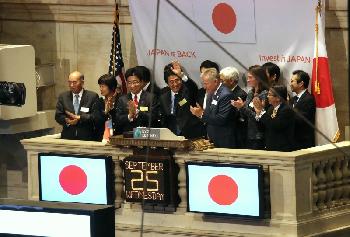 日本首相安倍晉三(圖中舉手者)25日主持紐約證交所收市敲鐘儀式,他背後掛著日本國旗及寫有“日本回來了到日本投資”英文字句的巨型布幕。當天他在紐交所發表演說,推銷“安倍經濟學”及日本復蘇情況。(圖:法新社)