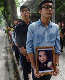 (越南)越南民眾週日列隊於武元甲居所外,等候入內吊唁,其中一人手捧著英雄遺照,神情肅穆哀傷。