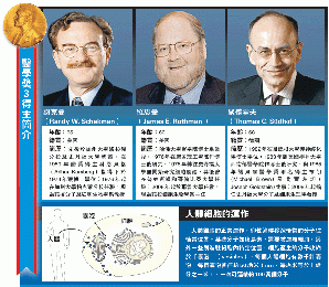 (美國)本年度諾貝爾醫學獎由美國與德國3個研究細胞囊泡運輸調控機制的科學家奪得。評審委員會稱讚3人的研究成果揭示了細胞內部最重要的運輸系統如何在準確的時間將其內部物質傳輸至準確位置,對瞭解免疫缺陷、神經系統病變與糖尿病以至自閉病等均有重要意義。