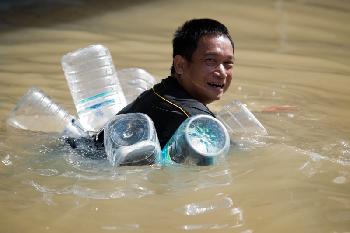 圖為曼谷東部的卡平布里(Kabin Buri),一名男子用多個膠水瓶自製“救生圈”,協助在水淹的街上“游泳”。(香港明報)