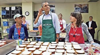 國總統奧巴馬(前排中)周一和聯邦政府職員一起做義工,到華盛頓地區食品慈善機構“瑪莎的餐桌”(Martha's Table)幫忙預備三文治。其間奧巴馬「豎起耳仔」傾聽記者提問,他在同一場合說﹕“如果共和黨人不願為造福國家而放棄自己的黨派立場,我們便很有可能違約,而違約可能會對經濟產生毀滅性的影響。”(圖:法新社)