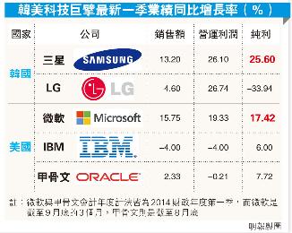(韓國)韓國和美國科技巨擘近期輪流派發上季“成績表”,三星和微軟分別在韓國電子設備生產與美國軟件生產市場上奏捷。三星10月25日公佈今年第三季業績,純利比2012年同期升25.6%,再創新高,表現遠勝本土最大對手LG。在美國,微軟錄得比2012年同期增長17%的純利,對比業績增長顯著放緩的IBM和甲骨文等商業軟件市場勁敵,表現鶴立雞群。