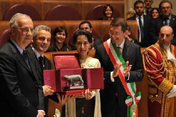 (意大利‧羅馬28日訊)曾獲諾貝爾和平獎桂冠的緬甸反對派領袖昂山舒吉早在1994年獲頒意大利首都羅馬榮譽市民,以表揚她以非暴力方式爭取民主和人權。事隔19年,她終於能夠親自前往領獎。