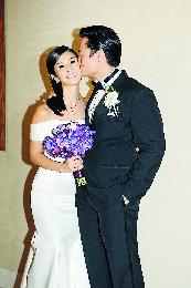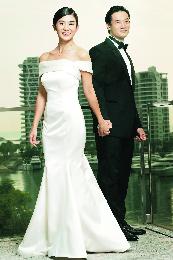 婚宴上Charlie又換上Vera Wang的晚裝,跟老公邱韶智手牽手讓傳媒拍照。(香港明報)