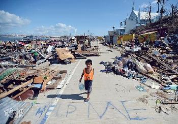 風災過後的塔克洛班市,幾乎看不到完整的建築物,災民缺乏食水供應,有人在地上寫上HELP ME字句,希望儘快獲得救援。