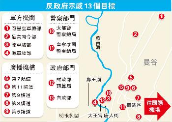 (泰國)泰國爆發3年來最大規模反政府示威,首相英祿面臨上台兩年來最大政治危機。由在野民主黨率領的數以萬計示威者,昨早兵分13路,操往政府機構、軍警總部及電視台,誓言要將塔辛政權連根拔起。示威隊伍昨日先後佔據財政部、外交部及政府公共關係部,並以外交部為大本營。首相英祿則重申不會辭職或解散國會,昨晚又宣佈在大部份曼谷市內以及周邊地區包括機場,實施內部安全法,有需要時可封路和宵禁。消息稱,倘反政府示威者與支持塔辛的紅衫軍爆發衝突,軍方可能出手。