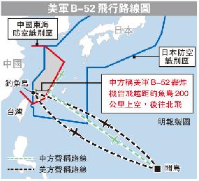 五角大樓發言人沃倫(Steve Warren)透露,美軍兩架B-52遠程戰略轟炸機在美東時間25日進入中國防空區,飛越釣島,事前未通知中國。他表示:“我們飛入該空域時,不會通知我們的飛行計劃,也不會自報應答機身份識別、無線電頻率和標識。”