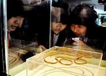 中國29日宣佈將啟動南宋沉船“南海一號”的全面發掘,用三四年時間,取出全船6萬至8萬件文物。圖為在廣東陽江海上絲綢之路博物館,一些民眾正在欣賞早前從“南海一號”打撈起的金屬文物。(圖:法新社)
