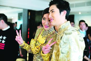 一對新人對於記者多次要兩人接吻的要求有求必應,蔡加讚戴領巾有圓點,新娘子即甜笑說:“他都把我(圓圓)放在身上。”兩人同是27歲踏入人生新階段,所以當天心情只有開心,對於家婆要求他們生6個小朋友,圓圓瞪大眼:“不是吧?”新郎則笑語:“辛苦你了!”他們稍後才會去度蜜月。(香港明報)