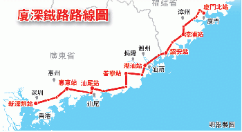 中新社報導,廈深鐵路昨日開始不載客的全線試運行。廈深高鐵全長502公里,途經廣東的深圳、惠州、汕尾、揭陽、汕頭、潮州和福建的漳州、廈門8個城市。深圳媒體此前透露,廈深鐵路全程20個車站的名稱分別為:廈門北-前場-角美-漳州南-洋奎-漳浦-雲霄-詔安-饒平-潮汕(沙溪)-潮陽-普寧-葵潭-陸豐-汕尾-魚後門-惠東-惠州南-坪山-深圳北。不過,這條高鐵設計時速僅200公里,與一般動車速度相若,約3小時可走完全程。目前鐵路部門尚未公佈廈深鐵路票價,按照以往定價標準,廈門到深圳全程一等票價約為190元(人民幣,下同),二等票價約160元。