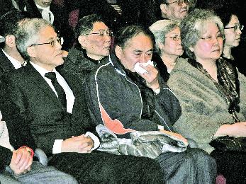 馬鼎盛、馬鼎昌及紅虹在台下觀看特輯時,馬鼎昌(中)邊看邊飲泣。(圖:香港明報)