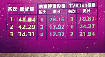 TVB公佈最佳男主角3強的專業評審與觀眾的分數,視帝黃子華在觀眾投票當中只排第3。(圖:香港明報)