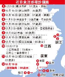 廣東省衛計委19日通報,深圳確診一宗人感染H7N9禽流感個案,38歲男患者姓歐,廣東高州人,家住深圳龍崗區南嶺村,現病情危重。12月9日,患者出現發燒、咳嗽症狀,曾到診所、醫院就診,17日深圳市疾控中心對他做肺泡吸取液檢測,樣本呈H7N9禽流感病毒核酸陽性,翌日經廣東省疾控中心覆核確診。患者現時在深圳市第3人民醫院治療。