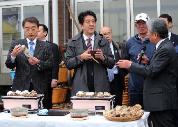 日本首相安倍晉三參拜靖國神社後,中國《環球時報》呼吁將安倍列為不受歡迎人物,禁止入境。圖為安倍(中)27日在日本大地震災區宮城縣石卷市一間生蠔養殖場試食。(圖:法新社)
