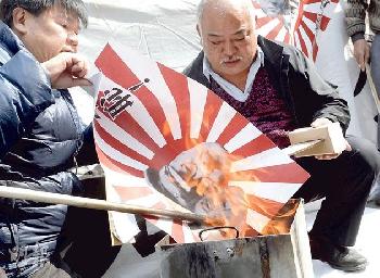 十多名保釣行動委員會成員27日遊行到日本駐港總領事館,焚燒日本軍國國旗和請願信,抗議安倍參拜靖國神社。(圖:香港明報)