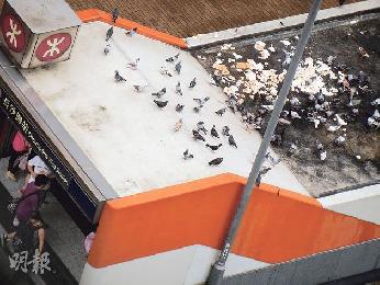 (香港)禽流感陰霾下,香港多個黑點仍見大批野鴿,傳播病毒風險不容忽視。其中長沙灣東京街,每天有過百隻野鴿覓食,有居民從高空觀察半年,發現有數名市民經常放下大批食物餵鴿,其中一名婦人更採取“新招”,將麵包拋上港鐵站出口頂部,難為清潔工要爬梯清潔。港鐵曾採取多種方式趕鴿,包括吊起光碟,又設蜂鳴器,記者到現場觀察,發現附近的建築物花槽及天橋邊都有鳥糞,清潔工人須每天清洗。附近居民曾多次向食環署投訴,情至今仍未改善。