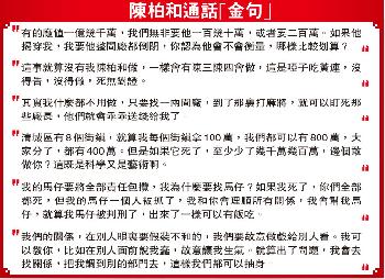 電話中陳柏和用粵語說,以他今天的職位,要“盯死”轄區內任何一個企業都是很容易的事情,要盯就最好盯住資產高,最好資產過億的企業。“清城區有8個街鎮,就算我每個街鎮拿100萬,我們都可以有800萬,大家分了,都有400萬”。他又說,只要找一兩間廠,到了那裡打麻將,就可以盯死那些廠長,他們就會乖乖送錢給我了。
