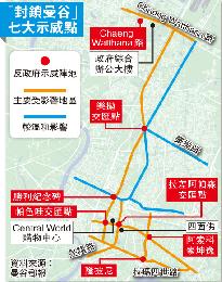 曼谷市中心大型購物中心世貿百貨門外,昨早已有數萬名反政府示威者佔據廣場空地。示威者昨封鎖市內8個重要建築物、7個主要交通路口(見圖)。整個曼谷交通陷入癱瘓,400所學校停課,上百萬居民的生活工作受影響,很多居民選擇乘坐天鐵捷運或地鐵上班,有的決定請假留家,亦有公司甚至索性放假。Twitter和facebook上網民紛紛上傳封城照片,有大量民眾投訴封城帶來不便。泰國機場昨向出租車發放約6000個特殊通行標貼,以提醒示威者這輛出租車內載有乘客,希望能夠暢通放行。