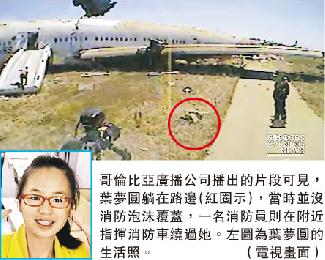 (美國)最新曝光片段顯示,2013年韓亞航班飛機在三藩市跑道撞機後,消防員曾清楚見到未被消防泡沫覆蓋的16歲中國女學生葉夢圓躺在地上,但消防員以為她已死,沒有施援,葉夢圓最終被泡沫覆蓋,遭消防車兩次輾過致死。美國哥倫比亞公司(CBS)1月15日播出去年7月6日空難現場救援片段,來自消防員頭盔攝像機和消防車上的攝像機。