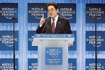 安倍當日在世界經濟論壇演講時說:“我們須克制在亞洲的軍事擴張,否則可能失控。”他不點名批評中國,指經濟成長效益不能浪費在軍事擴張上,又表示軍事預算應完全透明。他亦為上月參拜靖國神社辯護,重申靖國不僅供奉二戰戰犯,還紀念不分國籍的戰爭受害者,而他參拜時保證日本不會再捲入戰爭。